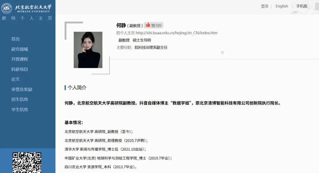 北航官网拍门,何静是2024、2025年“我国AI春晚”节目的暗地技能支持者和共创者,她开设“大模型与大数据”系列讲座和课程,宣布相关范畴国内外论文40余篇,以榜首/通讯作者身份宣布SCI/SSCI/CSSCI检索论文10余篇。
